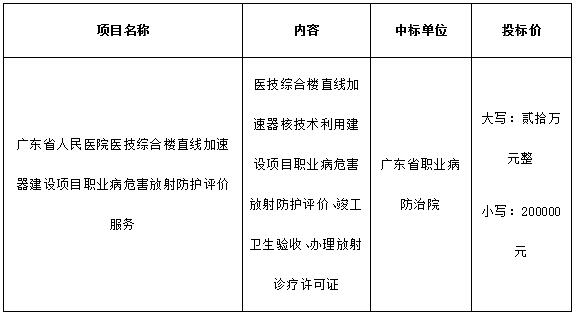 总务处基建房管科于2018年6月25日通过医院网上公布,采用公开竞争性谈判方式采购直线加速器建设项目职业病危害放射防护评价服务。7月3日,经专家组评审,监督人员的公证,得出最后结果。现公布结果如下: