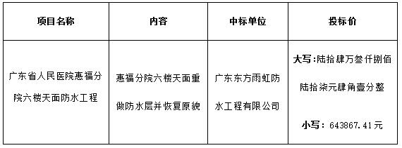 广东省人民医院惠福分院六楼天面防水工程招标结果公告