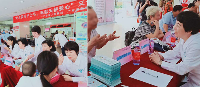 4月26日上午9点,在博罗县人民医院门诊大堂,糖尿病、伤口造口、康复、老年安宁疗护、心血管、儿科、骨科、手术、重症、肾病、介入、急诊等10余个专科的15名省医护理专家及来自眼科的蓝剑青医生、心血管内科的陈海敏医生为博罗县民众开展了相关疾病的健康咨询及指导。现场还设有免费测血糖、测血压、量身高和磅体重等服务项目。测血糖和血压的过程中,很多前来咨询的患者不知道自己的血压、血糖情况,经过此次义诊才发现异常。来博罗县人民医院看病的张阿姨,测得空腹血糖12.6mmol/L,经过现场糖尿病护理专家的及时指导,准备进行全面的检查和治疗。还有些高血压患者对高血压药物的用法及注意事项不了解,没有坚持吃药,经过义诊专家的耐心解释,患者表示会坚持服药并定时监测血压。