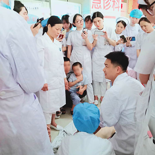 义诊现场最火爆的要数心肺复苏急救技能的演示了。 两位急救专家被患者及当地的护理人员围得水泄不通,大家都对省城带来的最新最权威的急救技能演示竖起了大拇指,急诊的专科护士周浩也因此收获了很多同行及群众“粉丝”。