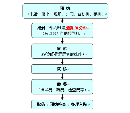为改善我院门诊服务,从2014年11月13日起,我院将在东川门诊内科、外科、心理精神科、中医科、正骨科和肿瘤科执行就诊新流程。(已执行新流程科室:妇科、产科、生殖助孕科、儿科与康复科流程不变)新流程如下: