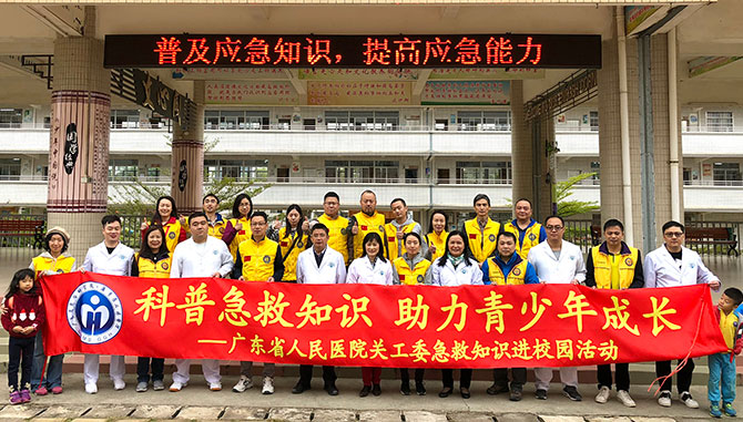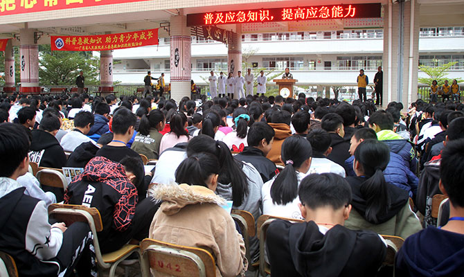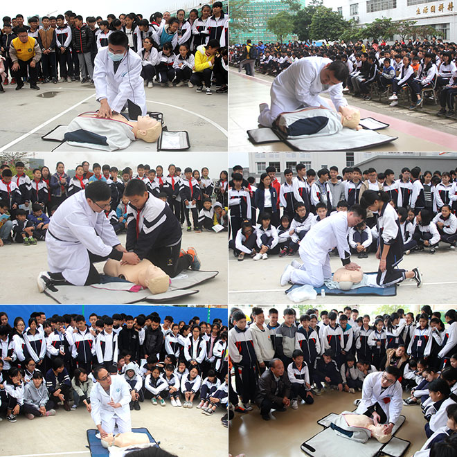 为让乡校学生懂得生命的宝贵与脆弱,了解自救、互救知识,掌握急救技能,我们来到郁南实验中学为师生开展急救技能培训。在学校操场,2300多名师生聚精会神,认真听取健康安全知识培训讲座。急危重症医学部曾耀威结合师生日常生活实际,编排了授课方案,结合一个个生动的真实案例讲解普及急救知识的意义、救护新概念、意外伤害预防、自救互救、急救的黄金时间以及如何判断心跳呼吸停止,如何进行心脏按压和心肺复苏的操作流程,并根据学校学生情况,进行分批分组实操练习。主任医师何朝生、急危重症医学部的医护人员曾耀威、张辉、张正坤、陈凯龙利用人体模型作心肺复苏演示,手把手地纠正同学们在“施救”过程中的不规范动作。通过热烈的互动问答,逼真的模拟演示,使同学们初步掌握了心肺复苏的基本要领,懂得了中暑、溺水、触电等突发事件的急救知识和方法,提高了正确认识生命、尊重生命、珍爱生命、敬畏生命的意识。校长丘仁杰感慨地说:“急救知识进校园为教学课程补上重要的一课”。