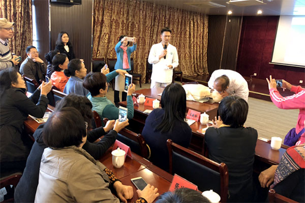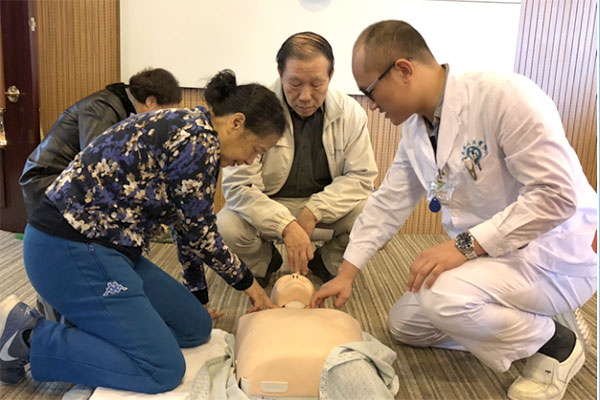 我院急危重症医学部周浩、张演尧两位老师为志愿者授课。周浩老师结合临床的真实案例逐一讲解创伤、溺水、气道异物、中风等急危重症患者的家庭急救及预防知识,对猝死的处理及心肺复苏术进行了重点讲解,特别是带来了4分钟黄金救护时间、避免过度通气等急救新概念。周浩、张演尧利用人体模型示范心肺复苏术,分步讲解每个步骤及操作中注意的事项。在分组的操作训练中,志愿者们踊跃参与,主动提问,认真训练,现场气氛十分活跃。