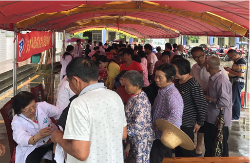 在中坝镇卫生院义诊现场,来就诊的群众络绎不绝,本次活动重点为省定贫困村元田村、发昌村、松梓村、北坑村的村民开展心血管科、肾内科、中医科、內分泌科、眼科、皮肤科、内科、外科、妇科、儿科、健康管理的义诊服务,并为有需要的群众查眼底、做心电图、测血糖、量血压等。在倾盆大雨中,专家们认真倾听老百姓的病情陈述,仔细询问病史和生活习惯,耐心细致解答,开出处方并指导用药,为他们提供切实可行的就医方案和健康指导。