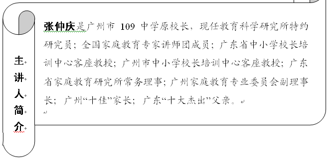 时 间:2014年5月6日下午3:00时 地 点:东一号楼3楼学术会议厅 主 题:好家长,成功路上与孩子同行 主 讲:张仲庆教授