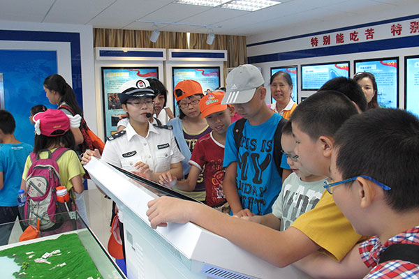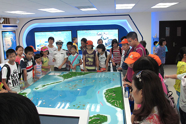 在渔政南海总队展览大厅里,通过图片、沙盘、实物、体感互动系统、触摸机以及中国渔政在南沙守礁维权斗争纪实视频等形式,介绍了南海的历史沿革、战略地位、资源分布、岛礁概况、海上救助、护渔维权等情况,使大家更好地了解到我国是海洋大国,海域辽阔,渔业资源和海底油气等矿产资源极其丰富。但是,我们面临错综复杂的海洋形势,许多岛礁被侵占,资源被掠夺,渔民生命财产和国家安全受到严重威胁!要想大力发展海洋经济,实现海洋强国,必须强化公民海洋国土意识,改变重陆轻海的思想影响,维护国家海洋权益,树立民族自豪感和历史责任感。