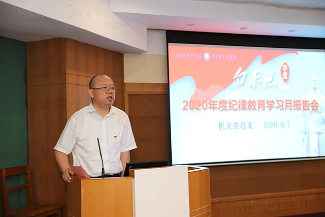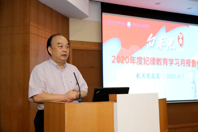 为深入推进年度纪律教育学习月活动,切实把政治建设摆在首位,把纪律规矩挺在前面,抓住“关键少数”,抓实基层支部,9月7日下午,纪检监察处会同机关党总支在东一号楼学术会议厅,举行白求恩学堂第202讲——纪律教育学习月报告会。机关副科长及以上行政干部、全体党务干部、总务处、设备处、信管处、招采中心、GCP、伦理办等有关负责人及敏感岗位人员共计198人参会。会议由机关总支书记郑卫平主持。