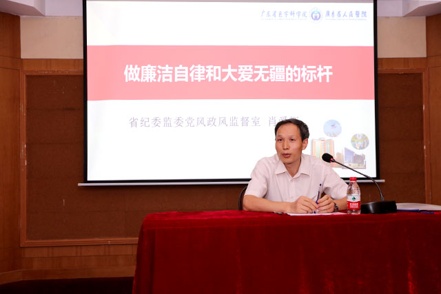 报告会邀请了省纪委监委党风政风监督室肖爱辉副主任作题为《做廉洁自律和大爱无疆的标杆》的报告。肖主任以近期发生的鲜活案例,警醒医院工作人员要严守底线,把廉洁用权、廉洁修身、廉洁齐家、廉洁交往作为树立廉洁自律标杆的根本,管住欲望,工作中谨小慎微。他特别引用习近平总书记对医务工作者“敬佑生命、救死扶伤、甘于奉献、大爱无疆”的寄语,强调要弘扬医德,做大爱无疆的标杆,要长修责任之心,仁爱之心,有家国情怀,同时也需要组织严管厚爱,通过全面从严治党,严抓主体责任牛鼻子,抓早抓小,防微杜渐。