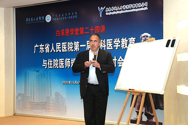 耿庆山书记致辞说到:新医改提出,要加强基层医疗卫生人才队伍建设。其中,住院医师规范化培训是我国医疗改革卫生人才队伍建设的一项重点工作,全科医生的规范化、标准化培养是解决基层医疗的关键着眼点。为提高基层医疗卫生机构服务水平和质量,应积极推进全科医生培训和住院医师规范化培训。此外,建立分级诊疗制度,社区家庭医生扮演着多种角色,不仅要管病患者的健康,还要管医疗保障,甚至在由社区医院转诊到综合医院,制定诊断方案等方面起到重要作用。因此,全科医学教育在我国刚起步不久,如何通过规范化培训培养出色的全科医生,解决基层医疗的“民生”问题,是当前国家医改重点关注的问题,也是分级诊疗的重要举措。这次特邀美国专家团队莅临我院分享美国综合医院住院医师的成功培养模式,为我院推进住院医师规范化培训提供宝贵经验。