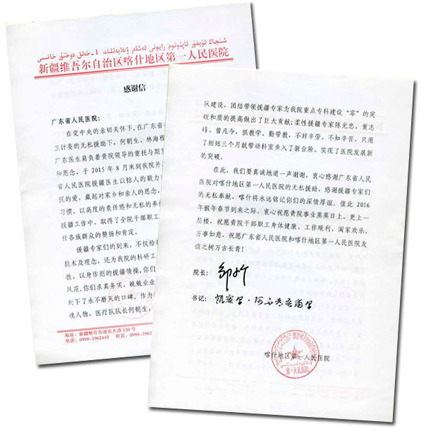 我院第五批援疆医生于去年8月赴喀地一院开展支医工作,他们充分发扬省医人精神,以惊人的毅力和满满的爱心,全身心投入到医疗援疆工作中,帮助喀地一院开展新技术,同时给科研注入新的活力,实现该院重点专科建设“零”的突破,赢得了喀地一院全体医务人员的信任和当地群众的赞扬。