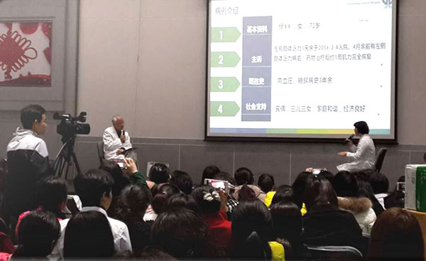 黄惠根主任主持这次的护理查房,病例选取一例老年脑梗死患者。首先是病例分析。张中南教授从患者病史的问诊,既往史及病人日常生活习惯、用药情况等,都详细询问,体现张教授对患者的精细管理。他还针对脑梗死的发病机理结合患者的发病经过提问。作为老年专科护士李少芳、古瑞平一一准确回答。张教授强调:“护士要懂得定位体征,因为护士要观察病情的变化,病人不可能天天做CT和MR。”道出护士在临床工作中的重要性。