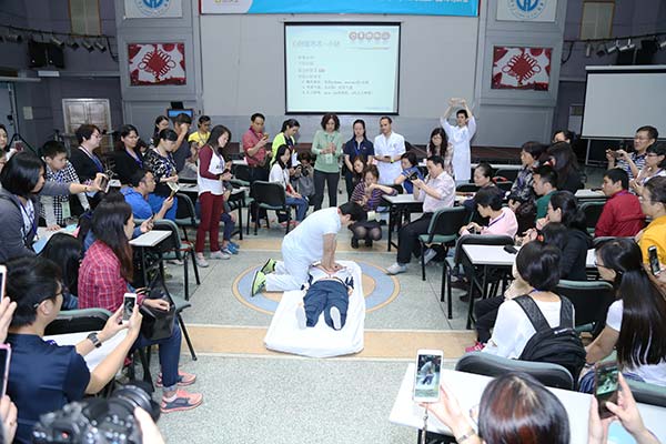 CPR实练分为四个小组,分别由四位富有经验的医生、护理和治疗师担任。培训师边演示边讲解作要点。学员操作时,最终判定是否合格的是CPR模型——“安妮”。培训师会在旁边监督和指导,保证每个学员都能真正掌握CPR急救。