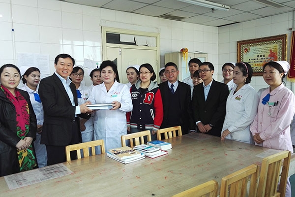 史伟主任向喀地一院肾病科古丽鲜主任赠书