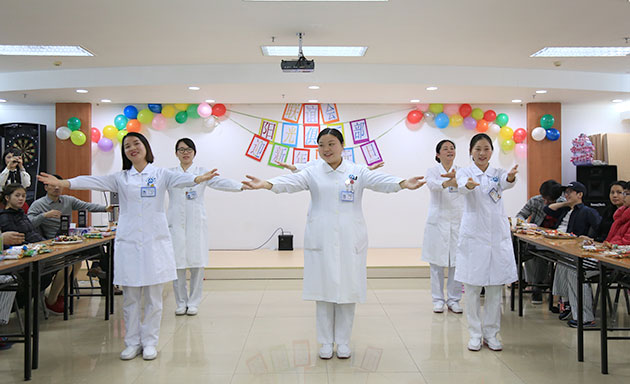 活动现场被彩带和气球包围,桌面上摆着一盒盒精美的礼品,充满浓浓的节日气氛。台上,医护人员和患者合唱的《军中绿花》、出院康复病友的街舞表演、吉他献唱等精彩节目赢得在场观众的阵阵掌声。在台上表演节目的除了医务人员,还有正在接受治疗的精神病人及已经康复的出院病友。