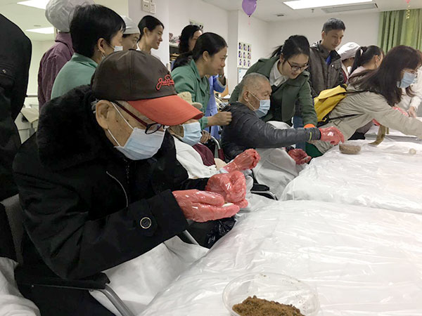 自已动手圆乐趣多,医患一起做汤圆。对于手功能相对较弱的患者,医护人员手把手指导,让每位老人家都能够享受到自制汤丸的乐趣。揉面的、搓制的,大家合作有序,一边聊天,一边制作汤丸,现场一派祥和的气氛。