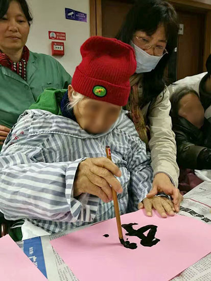 汤圆做好了,大家迎着《东方红》的气势,高声歌唱《社会主义好》。接着,住院患者即席挥毫,沉肩、坠肘、悬腕,让患者不知不觉地投入了运动控制的有效训练当中,并且通过让患者亲自拿笔字,患者的注意力、结构认知能力得到充分训练。看着他们力透纸背的字体,无法让人相信他们大多是肢体失能的病人,让人敬佩由生。