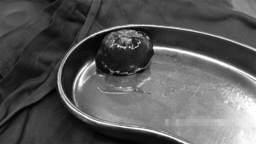 通过房间隔切口,“罪魁祸首”终于露出了它的真面目:肿瘤位于左心房,直径约7cm,通体呈现球形,暗红色,表面满是粘液,脆的就像一大块豆腐脑,依靠一个很小的蒂长在房间隔上。这是粘液瘤,个头完全可以将一个成年人的二尖瓣口堵得严严实实从而导致患者猝死。阿地力主任小心的沿着肿瘤的根部将它从房间隔上完整的切了下来。大家都松了一口气。然而,肿瘤实在太大了,卡在房间隔那里取不出来,顿时大家的心都提到了嗓子眼。一定要完整切除,否则,肿瘤一旦碎裂,将会导致身体各个部位栓塞、种植转移,后果将不堪设想。扩大房间隔切口!肖飞博士果断做出了决定。同时阿地力主任伸手从心脏后方向前轻轻一推,肿瘤终于从心脏里面“蹦了”出来。瘤体非常完整,切除非常彻底!一下子,手术间里轻轻响起一阵欣慰的笑声,大家悬着的一颗心终于放了下来。
