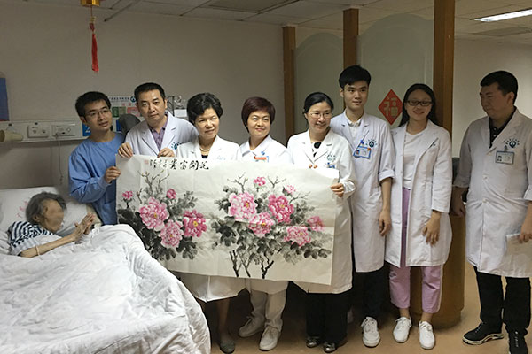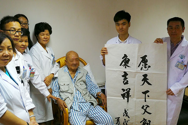 在东病区综合病区有3位年龄超过百岁的老红军,他们参加过一二·九抗日救亡运动、参加过二万五千里长征等,接受过抗日战争和解放战争的革命洗礼,他们为新中国的成立与发展做出了卓越的贡献,他们是时代的见证者,更是国家发展的推动者,也是这个时代的重要财富之一,正是这些最可爱的人赋予了我们今天的幸福生活,作为医护人员,让他们老有所乐、老有所医是我们的责任和神圣使命!感到欣慰的是:在综合病区医护人员的精心呵护下,老前辈们依然反应敏捷、思路清晰,党员团员同志们与老人们亲切握手,为老前辈们送上了诚挚的问候,并将东病区张凯军和庄立新医生的书画作品《花开富贵》、《父爱如山》和《愿天下父亲健康吉祥》赠送给三位革命老前辈,祝愿他们健康长寿、安康吉祥!