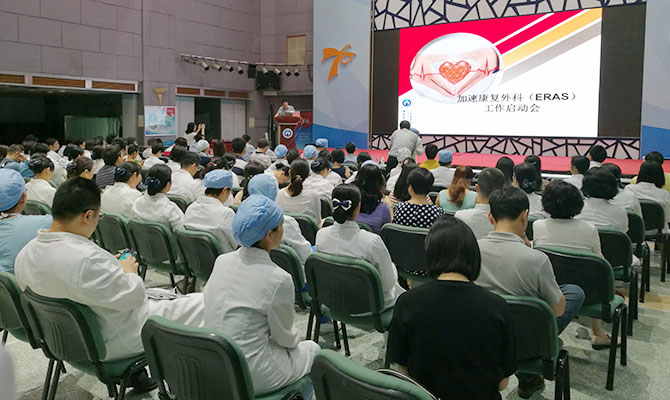 6月20日下午,加速康复外科(ERAS)启动会在的多功能厅举行。会议由医务处吴粤处长主持,袁向东副院长致辞,全院各术科、危重症监护科、麻醉科、手术室、临床药学科、康复科及营养科等科室病区行政正副主任、护士长及临床医师参加了本次会议。