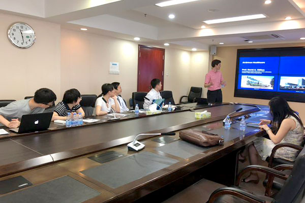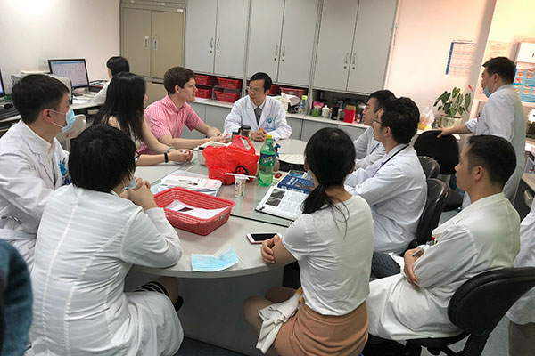 随后Clifton教授一行到心内八区,参加刘津、孙国力、贺亦波和郭照东等年轻医生为主的英文教学查房并做临床导向的学术指导,进行了临床细节融入AI技术看似“头脑风暴”的“实战讨论”。