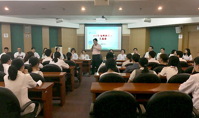 8月6日下午,大内科在保健楼三楼会议室进行2018年新员工见面会。省老研所所长兼大内科主任覃铁和、党总支书记冯军东,副所长高兴林、陈惠容,大内科副主任杜欣、沙卫红、梁馨苓,以及各专科主任、支部书记、科护长、团委书记等,与新员工们进行了面对面的座谈交流。