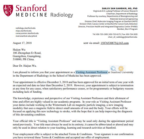 金秋九月是收获的季节,我院放射科吴海军博士收到了来自斯坦福大学的邮件,该校放射系主任Sanjiv教授亲自签发了邀请函,正式邀请吴海军博士为该系访问助理教授(Visiting Assistant Professor),这一Title是对我院吴海军医生科研能力的一大肯定。