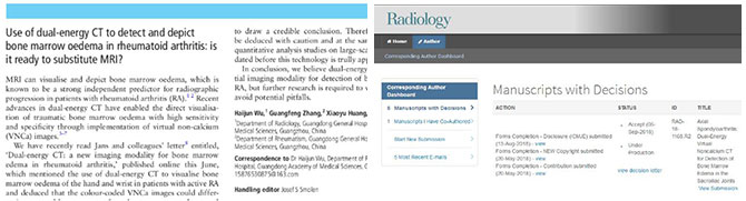 2016年吴海军博士受邀加入国际医学磁共振学会(ISMRM),近3年连续受邀为ISMRM年会摘要审稿,同时也是ISMRM会刊JMRI (中科院II区,2018 IF 3.612)的审稿人。吴海军博士近3年以第一作者累计发表中科院II区以上的论文5篇,尤其是今年6月底和9月初,研究成果先后发表在风湿病顶级杂志ARD(中科院I区,2018 IF 12.35)和放射学顶级杂志Radiology(中科院I区,2018 IF 7.469)上。此次获得Visiting Assistant Professor资格实至名归,也是医院领导高度重视人才培养,大力推动人才强院战略的结果。
