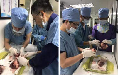 猪心解剖环节,学员在导师的指导下了解希浦系统解剖位置和室间隔厚度,以及电极放置技巧。