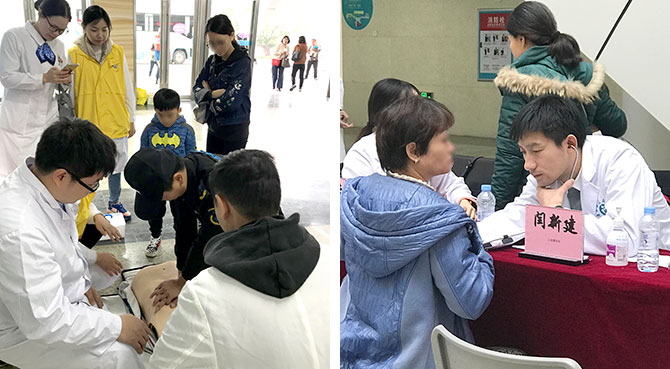 活动现场,前来咨询、问诊的群众络绎不绝,医护人员为居民提供医疗咨询、现场疾病诊治、量血压测体重等便民医疗服务,并为前来问诊的群众发放了高血压、高血糖、食药安全、中医养生、膳食指导等宣传资料并进行健康知识宣传。同时,专家、志愿者们还对前来咨询的百姓现场进行了心肺复苏技术的培训,详细介绍了心肺复苏的流程,并通过模型人偶对按压位置、频率进行了重点演示。