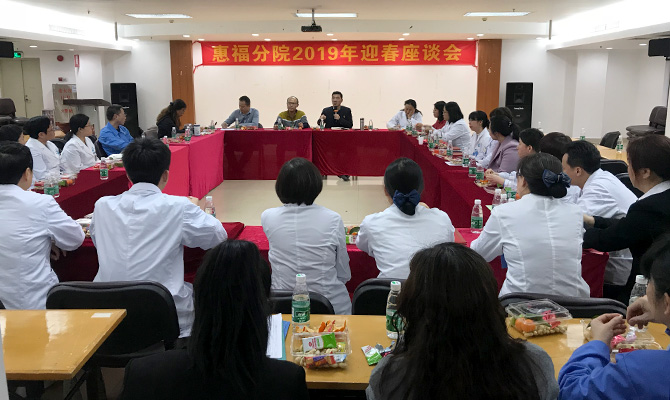 2019年1月28日惠福分院举办“凝心聚力,共谋发展”为主题的职工迎春座谈会。新任党办主任张忠林、分院全体行政领导、党总/支部书记、党员及职工代表等近百人参加了会议。