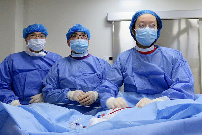 钱明阳主任和孙凌医师为患者进行心脏介入手术