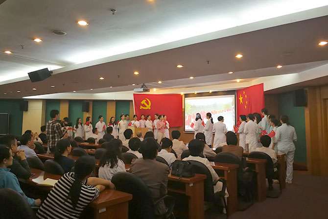 会议在综合病区支部党员合唱《我和我的祖国》的深情歌声中拉开了序幕,这曲表达对祖国依恋和热爱的歌瞬间点燃了大会的热情!总支书记冯军东首先谈到每个季度党员大会是总支一个特色活动, 将上级布置的党员教育学习内容和支部特色充分结合起来,增强了党课的针对性,提高了学习的吸引力,同时也提升了党建的影响力。大家通过学习,提高政治觉悟,让医护人员懂规矩,守纪律。接着综合病区支部党员胡培航和饶晶晶作了《学两会、谈保健》的演讲,展示了我院保健工作者尽最大努力做好“红墙保健”的点点滴滴。接着,支部委员王中华上了《聚焦两会》的党课,阐述了举国关注的“两会”的主要内容要点和精神,重点介绍了两会关于医改的新政策、新方案等备受职工关注的热点内容。支部委员徐永能还带领大家学习了近期党委学习文件。为了加强学习效果,综合病区支部精心准备了“两会”知识竞赛节目,党员大会在积极抢答中进入了高潮……