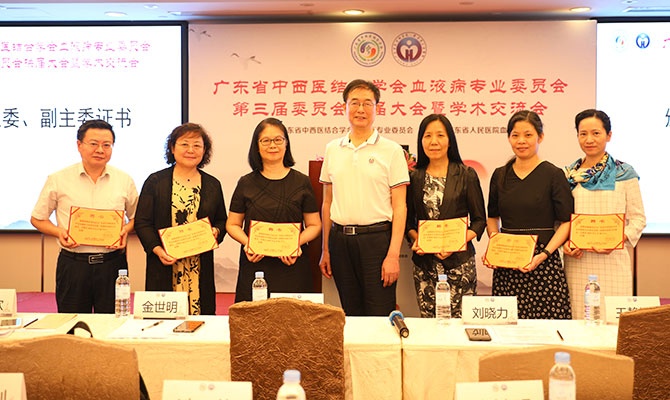 2019 年 6月21日,广东省中西医结合学会血液病专业委员会第三届委员会换届大会暨学术交流会议在广州召开,我院血液科杜欣主任当选主任委员、翁建宇主任当选副主任委员,换届大会由翁建宇主任主持,学会领导金世明副会长、学会办公室信统潇老师莅临大会。