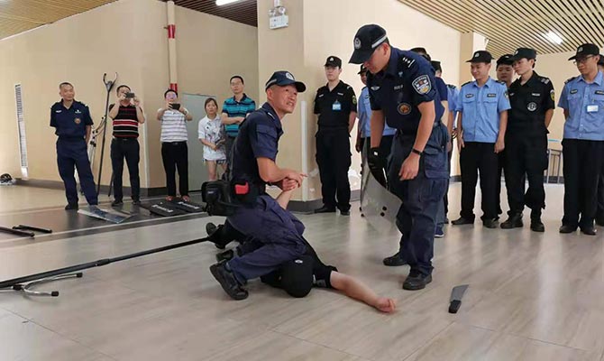 此次培训的内容包含擒拿、防暴器械腰叉、盾牌、警棍的使用技巧和注意事项、应急突发事件处置程序,并进行现场演示和指导,让安保人员真正掌握应对突发事件的技巧。