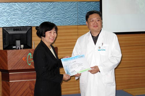 镜湖医院王庭槐院长给钱德英主任颁发演讲证书