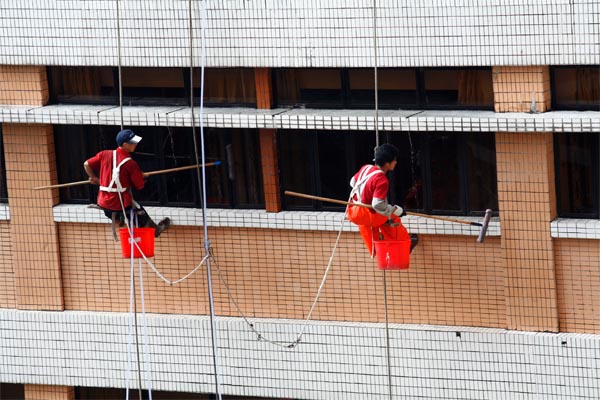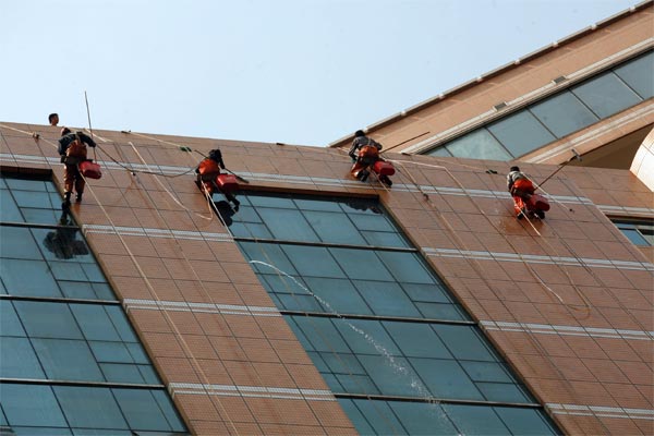 施工人员的安全是建筑物外墙清洗中最关键一环。为此,总务科严格要求委外公司执行《高处悬挂作业安全规程》,明确规定施工人员必须持有高空作业上岗证。登高操作前不能喝酒,过度疲劳和情绪异常的情况下禁止作业。