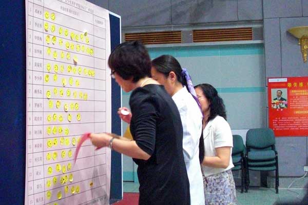 评委们认真评选心中的标兵