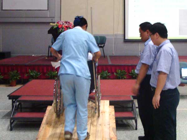本次技能竞赛项目是“轮椅运送病人”和“晨间生活照顾”。参赛队伍为5组医疗输送队(蓝色)和3组生活助理服务队(红色)。操作流程和评分标准经输送与陪护管理科多次修改及审核。为赛出水平,医疗输送项目精心设计了一个较窄的斜坡,每一位选手必须用轮椅平稳地推着“病人”上去,再下来,技术难度相当大。生活助理项目则以选手的精神面貌与服务态度来评分。