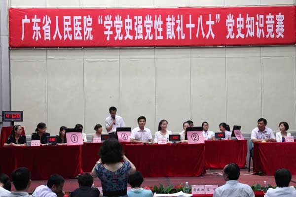 此次竞赛内容包括中共党史、创先争优、医院院史等知识,分个人必答、集体必答、抢答和风险题四个环节进行,共有11支党总支代表队踊跃报名参加。预赛分两场进行,第一场有6支代表队参赛,第二场有5支代表队参赛。赛前,各党总支都进行精心筹备,组织学习,精挑选手,大部分总支书记还亲自准备考题,加班加点演练;心研所、外科党总支书记亲自挂帅,担任队长;惠福分院党总支在本总支内组织选拔赛,内科、肿瘤中心和机关党总支联合开展热身赛;在院内掀起了“学党史、学院史、强党性,庆七一、喜迎十八大”的浓厚氛围。