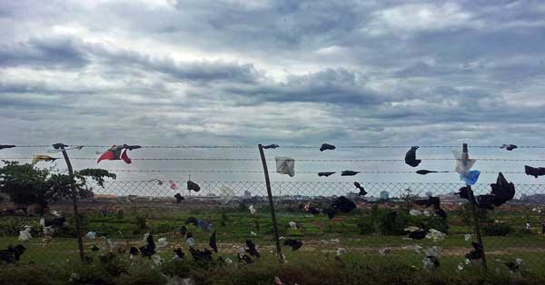 狂风横扫,飞舞的垃圾袋挂在铁丝网上,远看如同跳跃的五线谱