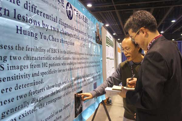 此次年会,我院呼吸内科共有2份壁报展示,2份摘要被大会收录。其中陈正贤等人的“气道内超声模型在预测肺外周病变恶性概率中的探索性应用”及黄禹等人的“肺周围型病变的气道内超声回声特征在周围型肺癌诊断中的应用” 引起国外同行的关注,在壁报展示期间,不断有国外同行前来索取资料及提问讨论。