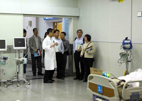 甄主任向来宾介绍了急危重症医学部的历史与现状,人员配置及培训教学查房等方面的总体情况。甄主任还详细地解答了来宾提出的急诊科医疗技术发展、急诊运作模式、急诊排班以及人力资源安排等相关的问题,为来宾提供了许多借鉴的经验。随后,代表团还参观了急诊科以及科内相应的先进配置,给予了高度的评价,并对我院长期对其的支持与互访帮助给予诚挚的谢意。