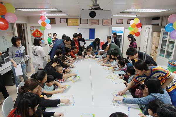 正在进行拼图比赛的先心病小朋友和家长们
