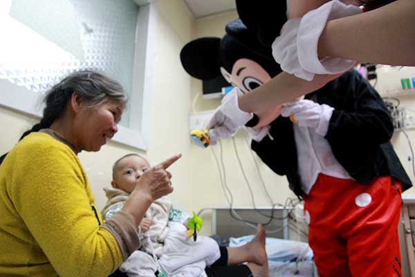 米奇走进病房向先心病小朋友派发礼物