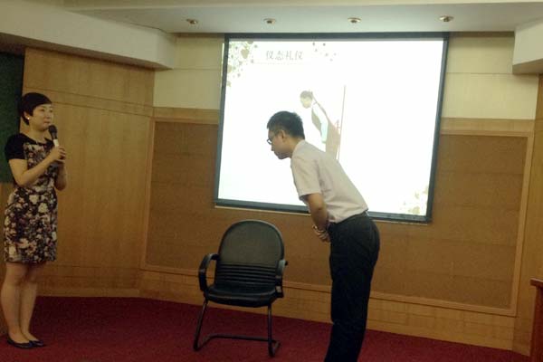 培训中,南航的培训老师从基本的仪容仪表、个人卫生到待人接物时的国际惯例,详尽地为大家讲授了日常生活、工作中应该注意的各项礼仪知识。大家都纷纷争先主动上台接受老师包括站姿、走姿、坐姿的指导,并积极进行了人物介绍、呈递名片等情景互动训炼。