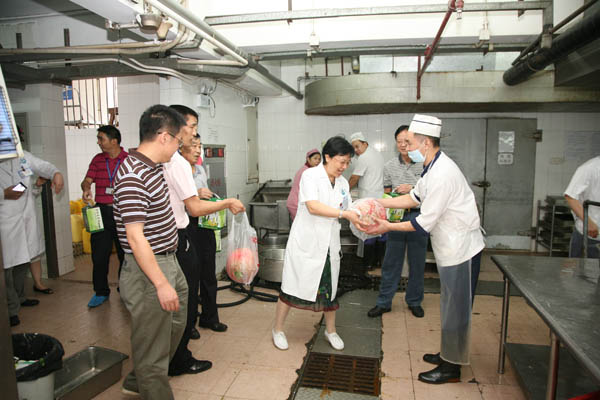 8月2日上午,夏日炎炎、烈日当空,院工会主席、党委副书记崔建星、工会副主席邓南、党办主任李肖环、总务处处长吴粤等领导亲临一线高温岗位,慰问膳食科、机电科、保卫科、车队、煎中药房以及输送科等特殊高温岗位员工,为在高温酷暑环境下坚持工作的职工群众送去了夏桑菊凉茶、西瓜等清凉饮品,带去清凉,送去关爱。