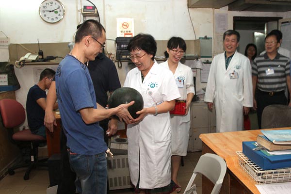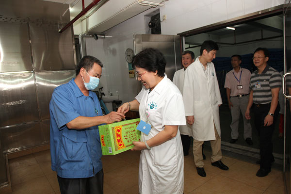 6月20日上午,烈日当空,院工会主席、党委副书记崔建星、工会副主席王铠及相关处室领导到一线高温岗位,慰问膳食科、机电科、供应室、保卫科、车队、煎药房以及输送科等特殊高温岗位员工,为在高温酷暑环境下坚持工作的职工群众送上了凉茶、西瓜,送上了一份清凉和关爱。领导们每到一岗位都详细了解了岗位的高温防暑等有关情况,对大家不畏高温、辛勤工作的敬业精神表示肯定,嘱咐大家要确保劳动安全,提高自我保护意识和防范能力,并勉励大家克服高温酷暑所带来的不便,再接再厉将工作做好,确保医院后勤的各项业务工作正常开展,为临床一线的医务工作保驾护航。