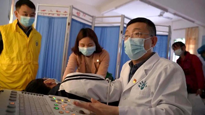 Wang Shushui, director of the Department of Pediatric Cardiology, is performing an ultrasound examination on a child.