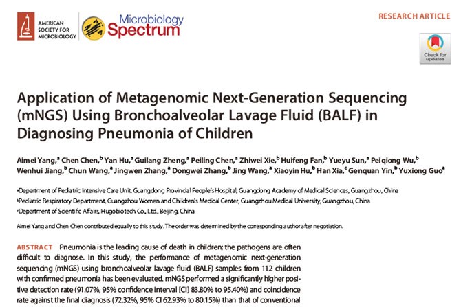 On September 28, 2022, Guo Yuxiong, Director of the PICU of our hospital, together with the team led by Yin Genquan, Director of the Department of Respiratory Medicine of Guangzhou Women and Children's Medical Center, published online the latest paper titled “Application of Metagenomic Next-Generation Sequencing (mNGS) Using Bronchoalveolar Lavage Fluid (BALF) in Diagnosing Pneumonia of Children” in the Microbiology Spectrum (JCR Q1, IF=9.034), a famous journal of the American Society for Microbiology. This study used metagenomics next-generation sequencing (mNGS) to conduct sequence determination of the specimens of bronchoalveolar lavage fluid (BALF) from 112 children with pulmonary infection to evaluate the diagnostic value of BALF-mNGS in the detection of children’s pulmonary infection pathogens.