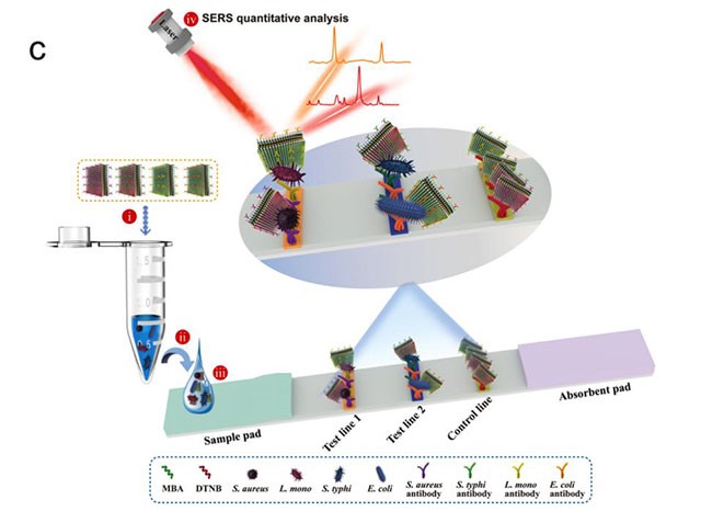 The team also developed a highly-sensitive immunochromatography assay technique for bacteria detection by using a multi-hotspot membrane-like SERS probe. The technique can simultaneously, quickly and accurately identify 4 important pathogens in complex clinical samples and environmental samples, with a sensitivity of 10 cells/mL (500 times higher than conventional colloidal gold test strips), and a total detection time of less than 20 minutes.